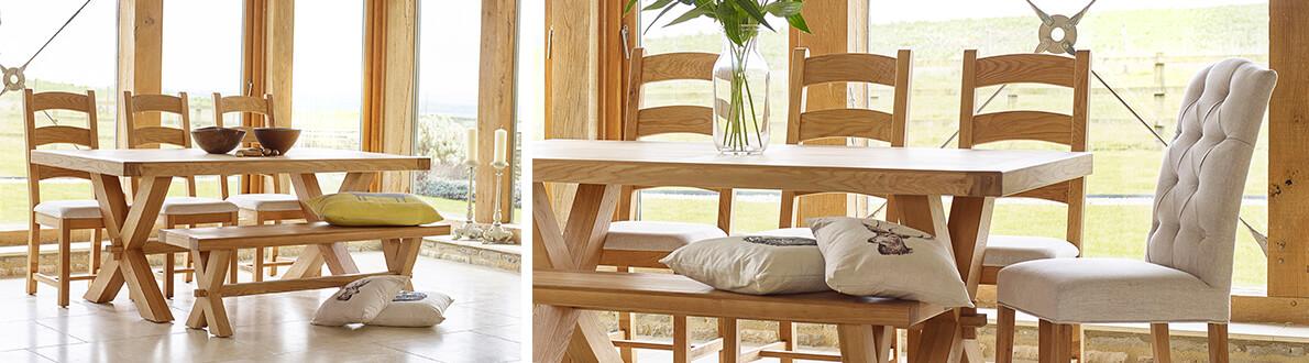 The Keating crossed-leg extending dining table is part of the Keating range of furniture, and pairs with the Keating bench, the button back chair and the slatted chair. Try a combination of all three for a relaxed and casual look.